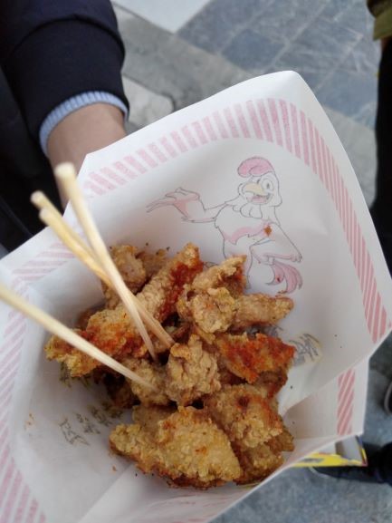 鸡柳裹着一层面。鸡柳和面并没有加盐,整体味道全靠孜然和辣椒。但味道还是不错的,有童年的感觉。