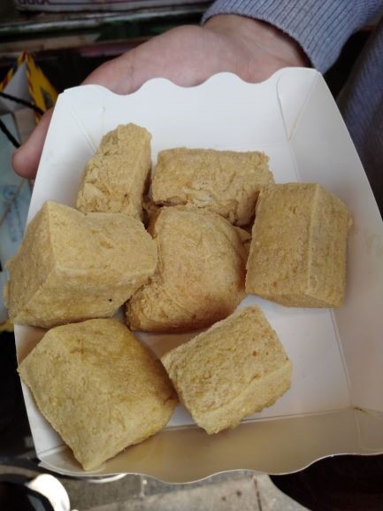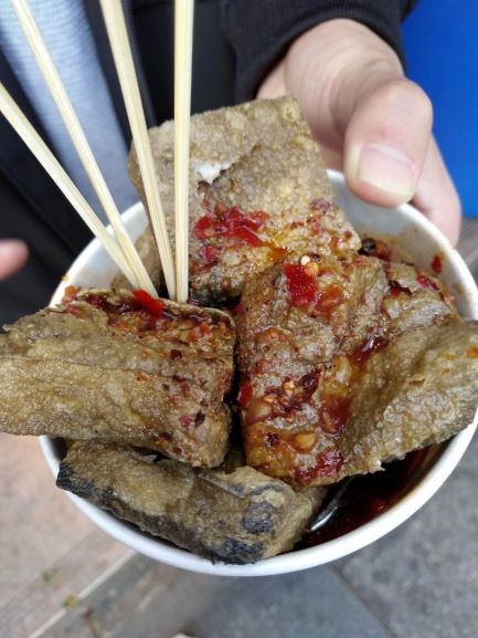 这家臭豆腐看起来比较像长沙的,黑黑的。也是现做的,但是比上一家的豆腐要蓬松一点,豆腐里面并不是实的。蘸料也比较好吃。唯一一点是蘸料和豆腐没有完美的融合。原先把豆腐放在汤料里比较好吃。